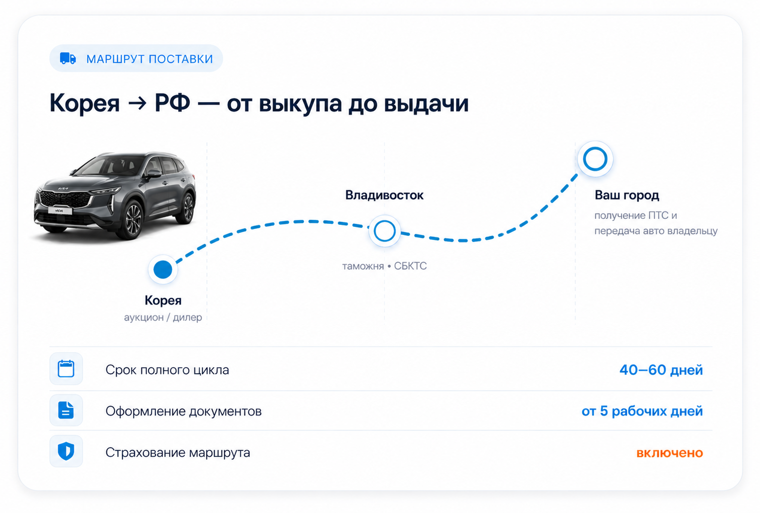 Привозим автомобили из Южной Кореи под ключ — с подбором на Encar и K-Car, проверкой по корейским базам, растаможкой, СБКТС и доставкой в ваш город. Срок от заявки до ключей: 30–45 дней. Левый руль, честный пробег, полный пакет документов для ГИБДД.